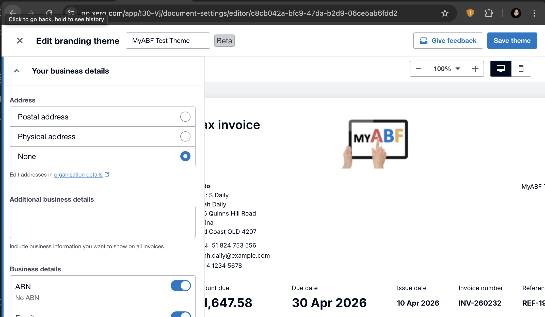 In this example the URL is: https://go.xero.com/app/!30-Vj/document-settings/editor/c8cb042a-bfc9-47da-b2d9-06ce5ab6fdd2