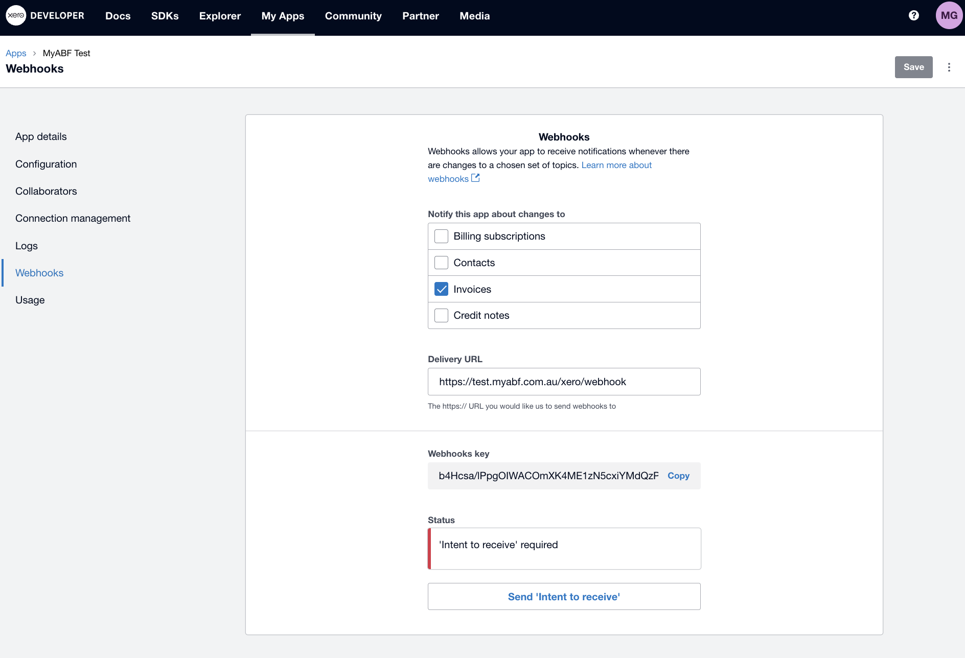 Confirm with your technical team that the Webhook key from Step 8 was added to the Cobalt configuration. Also check the Xero Developer Portal to confirm the webhook status shows as active. |