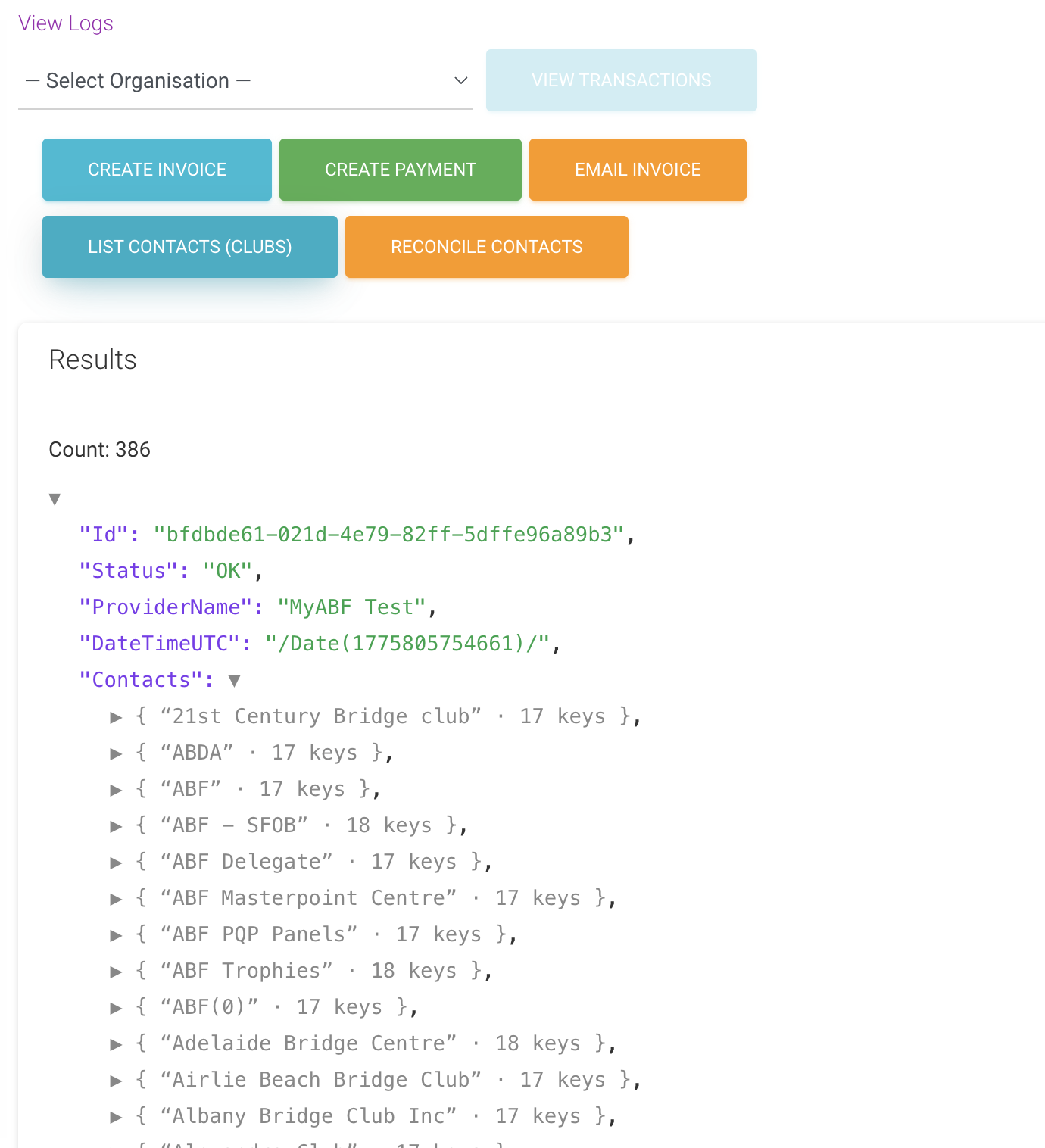 The response panel should show a list of contacts from your Xero organisation. If you completed Step 7, you should see the clubs you added.