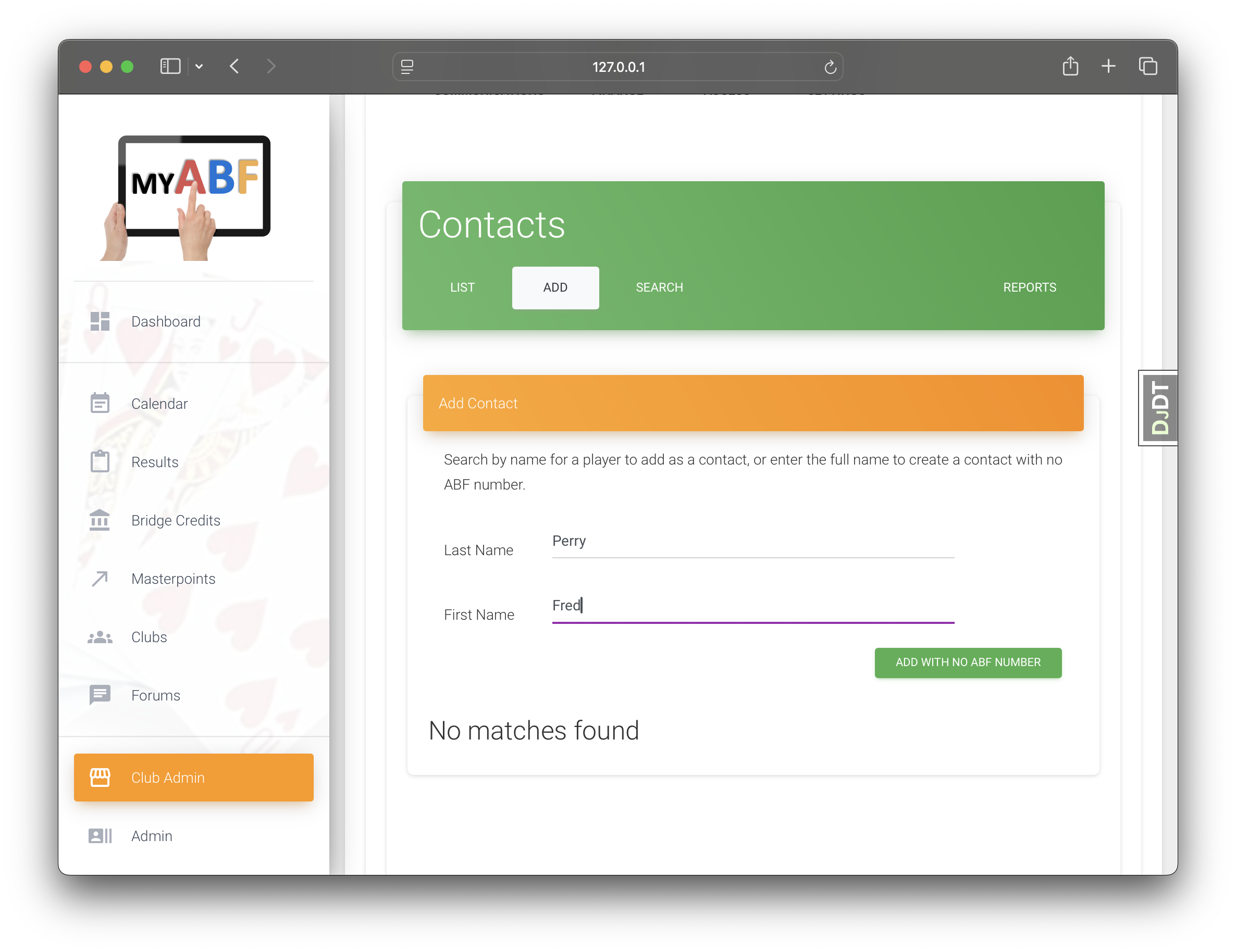 Using Fantasy Bridge Club, we add a contact who is not an ABF member.