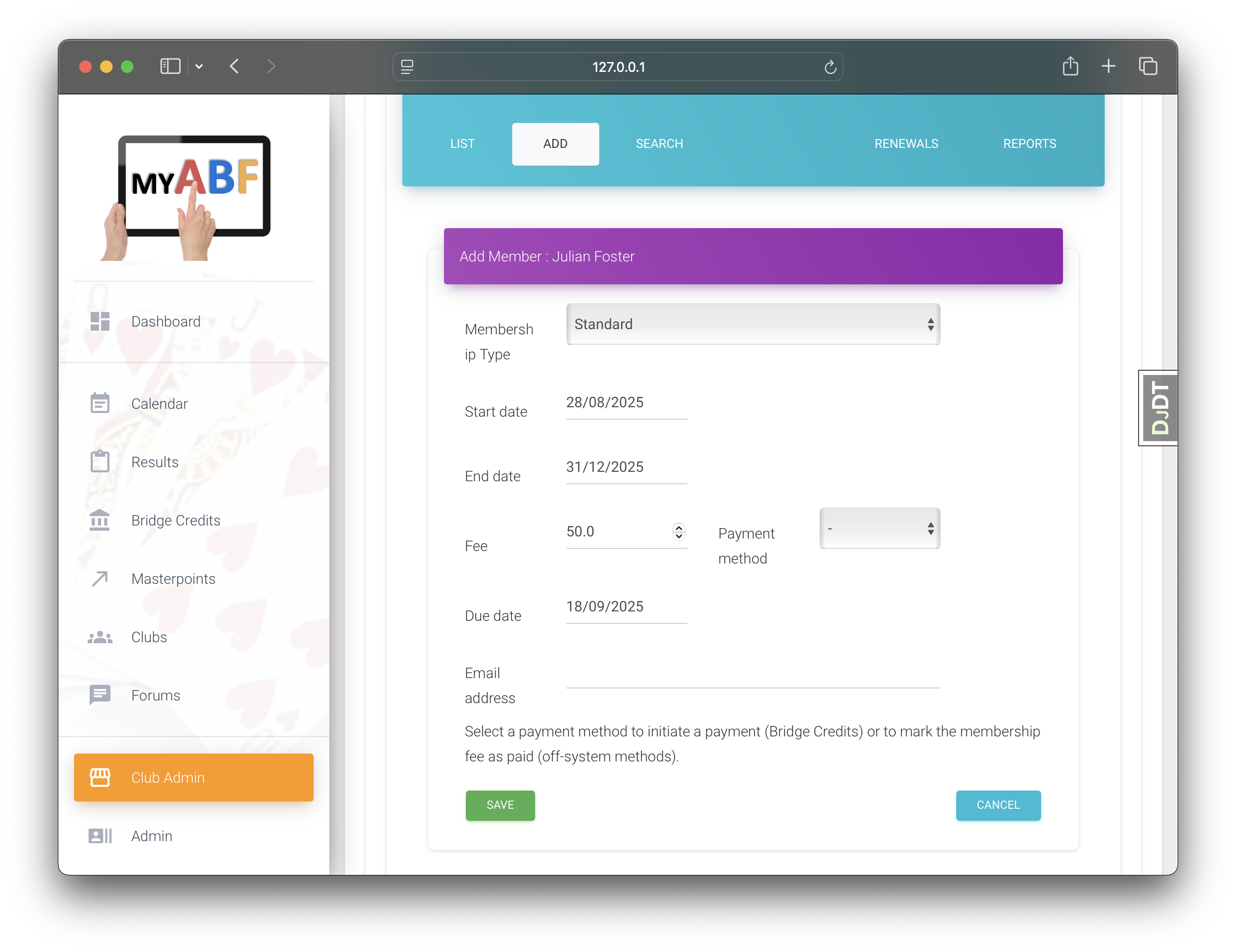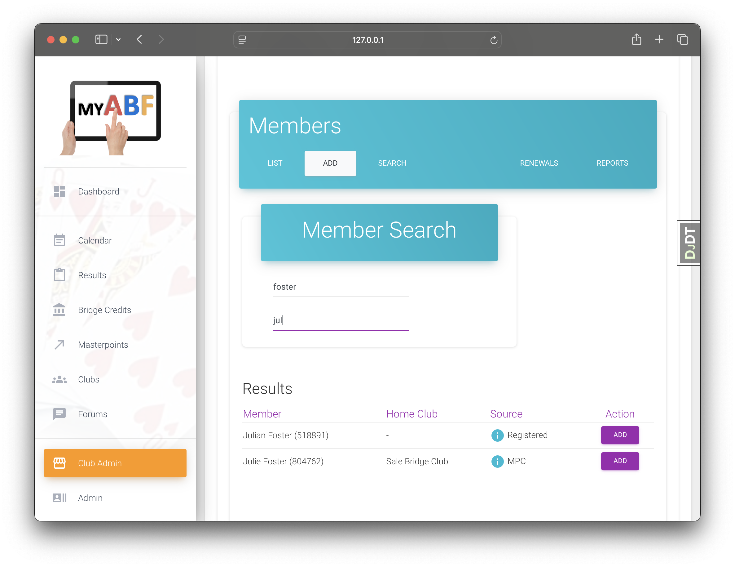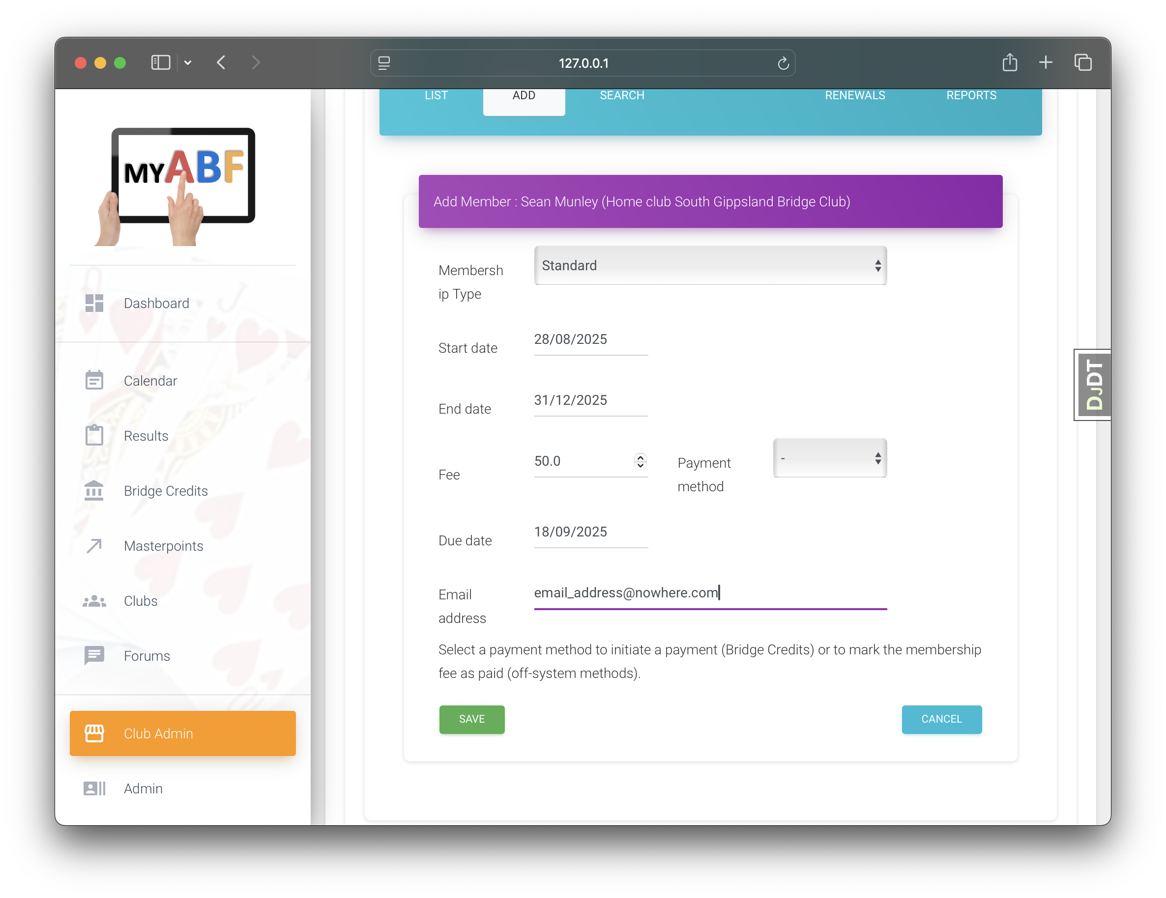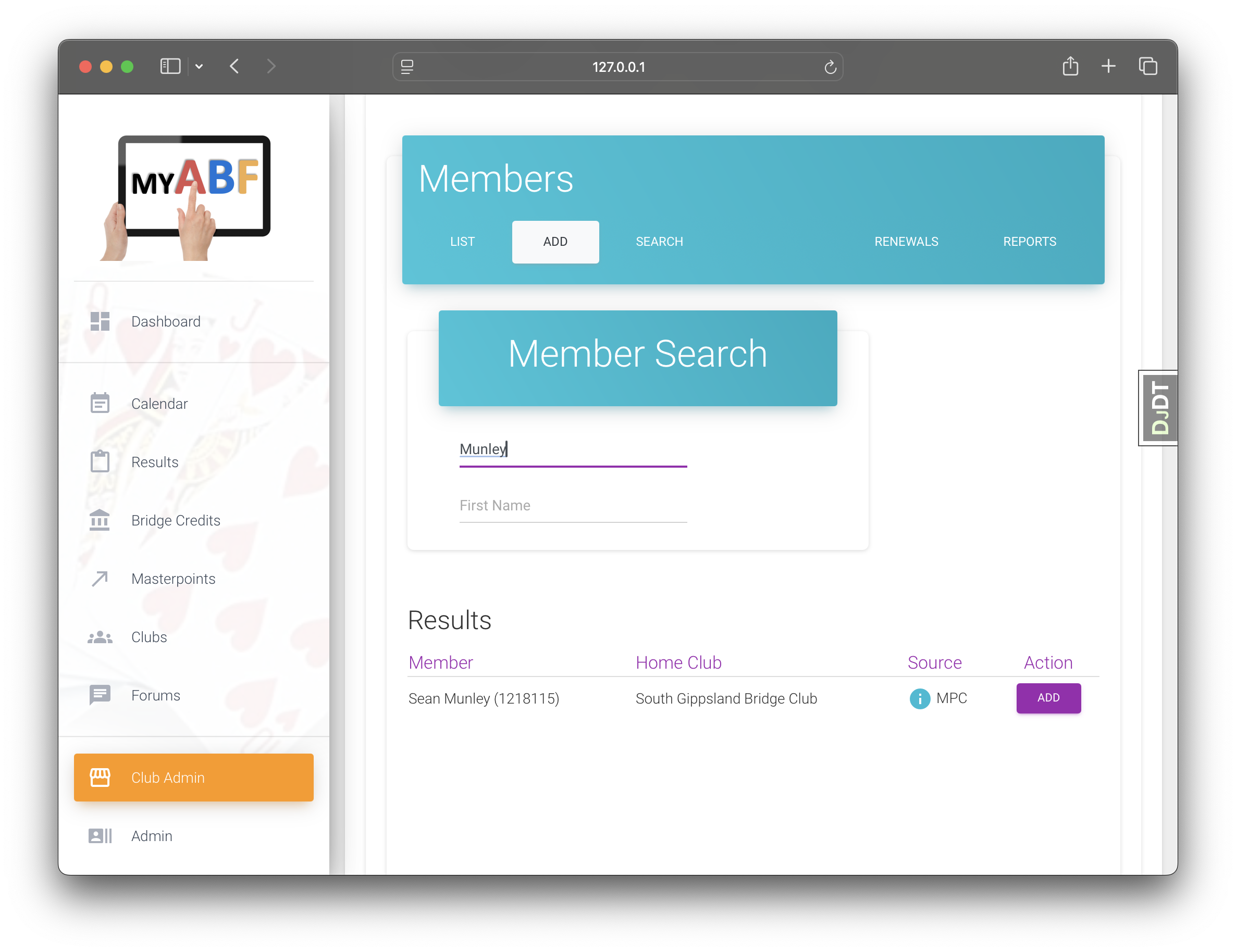Using Fantasy Bridge Club, we add a member who is not signed up for MyABF but is an ABF member.